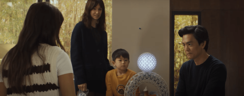 Curtis Pike (John Cho) is an executive at a small marketing company. He lives with his wife, Meredith (Katherine Waterston), an entomologist pursuing her Ph.D., and their three children: Iris (Lukita Maxwell), Preston (Wyatt Lindner), and Cal (Isaac Bae). One day at work, Curtis is introduced to an advanced digital assistant named AIA. Its capabilities far surpass existing technologies like Amazon’s Alexa. Representatives from the company include Lightning (David Dastmalchian), Sam (Ashley Romans), and Melody (Havana Rose Liu), who is also the voice of AIA. During these meetings, the concerned father becomes wary of the lack of transparency about AIA’s powers and data sources. Despite Curtis’ reservations, he is coerced by his boss (Keith Carradine) to bring AIA into his home for testing.
